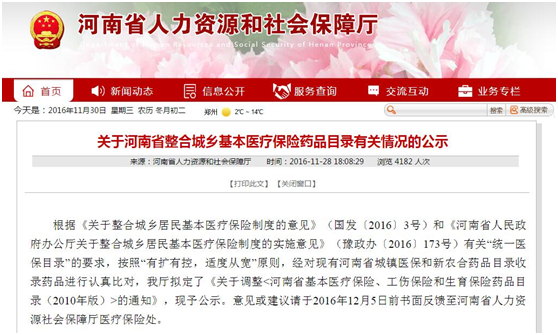 根據《關于整合城鄉居民基本醫療保險制度的意見》(國發〔2016〕3號)和《河南省人民政府辦公廳關于整合城鄉居民基本醫療保險制度的實施意見》(豫政辦〔2016〕173號)有關“統一醫保目錄”的要求,河南省人力資源和社會保障廳對《河南省基本醫療保險、工傷保險和生育保險藥品目錄(2010年版)進行調整。