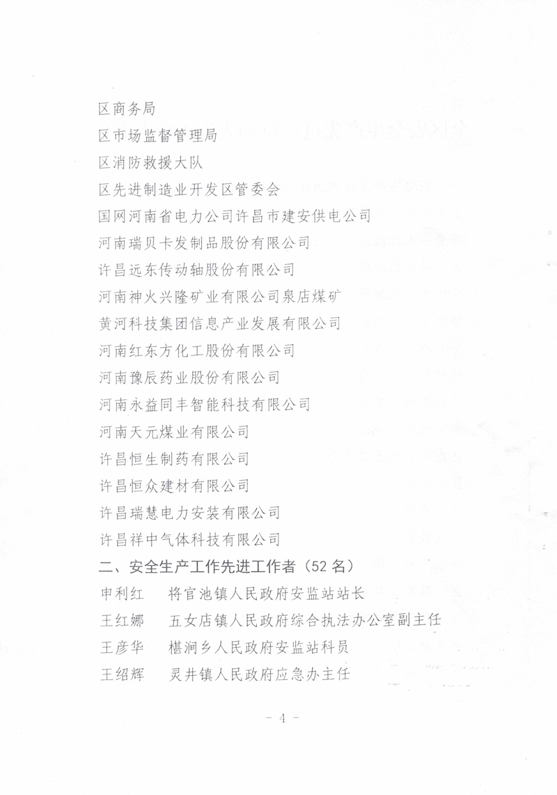 2021年,我公司以習(xí)近平新時(shí)代中國(guó)特色社會(huì)主義思想為指導(dǎo),全面貫徹落實(shí)黨的十九大精神,牢固樹立安全發(fā)展理念,嚴(yán)格落實(shí)安全生產(chǎn)“黨政同責(zé)、一崗雙責(zé)、齊抓共管、失職追責(zé)”,狠抓安全生產(chǎn)基層基礎(chǔ)建設(shè),排除潛在的安全隱患,保持了廠區(qū)安全生產(chǎn)形勢(shì)的總體穩(wěn)定。故許昌市建安區(qū)安全生產(chǎn)委員會(huì)對(duì)我公司在2021年度安全生產(chǎn)工作中的積極貢獻(xiàn)進(jìn)行了表彰,授予于“全區(qū)安全生產(chǎn)工作先進(jìn)單位”稱號(hào)。